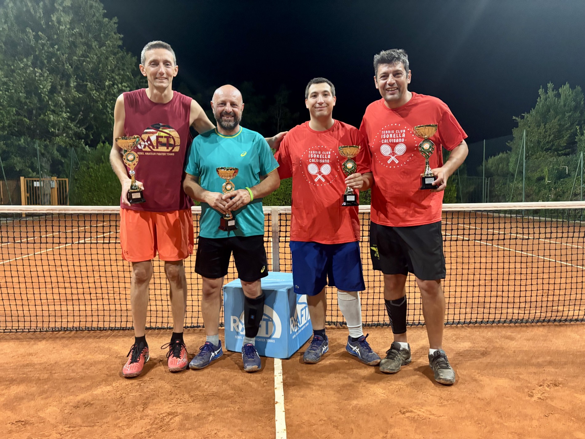 Si conclude oggi la tappa GOLD di Settembre all'ONDA TC. S'iscrivono in 24 con la partecipazione di diversi fighters SILVER. Primeggia tra tutti FABIO Bove che dopo aver sconfitto STEFANO Trani agli ottavi, non perdona neppure FABIO Pavani ai quarti; ottima prova per DIEGO Ritarossi agli ottavi che assesta una sonora lezione ad ALESSANDRO Capua, ma che a sua volta poi ai quarti la prende da CESARE Tulli che non gli lascia scampo. AUGUSTO Ferranti ha la meglio su ALESSANDRO Mirabile agli ottavi, ma poi dopo un primo set combattutissimo con ROBERTO Tullio ai quarti, soccombe pesantemente nel secondo; MAX Di Meo scavalca senza difficoltà ANDREA Fritegotto agli ottavi e affronta un agguerrito PAOLO Narducci ai quarti, che lo impegna il giusto ma senza impensierirlo piu' di tanto. FABIO Bove si complica la vita perdendo il primo set con CESARE Tulli in prima semifinale ed è costretto al sacrificio di concludere il match in terzo set, con un enorme dispendio di energia in piu'; spettacolone invece in seconda tra MAX Di Meo e ROBERTO Tullio, che disputano alle 18 di un pomeriggio umido come non mai. Tre ore di gioco tiratissimo in mezzo alla nebbia, con un tiebreak interminabile in primo set e l'inevitabile vittoria in terzo di ROBERTO Tullio che si aggiudica il posto in finale col risultato di 6/7 - 6/2 - 6/4 e un MAX Di Meo che esce dal campo devastato in termini energetici. Finale interessantissima oggi pomeriggio, FABIO Bove in una metà campo e nell'altra ROBERTO Tullio, spettacolo assicurato. Serve FABIO Bove aprendo il match con un doppio fallo che non lascia presagire nulla di buono, invece successivamente un Bove particolarmente carico e con un controllo di palla eccellente, spadroneggia in campo e mette in serissime difficoltà ROBERTO Tullio che si difende come può, ma non a sufficienza da impedire a FABIO di aggiudicarsi il primo set per 6/2. E' nella metà del secondo tuttavia, che ROBERTO Tullio, dopo aver fatto l'appello di tutti i Santi del Paradiso e dopo aver scaraventato più volte la sua malcapitata racchetta in ogni dove, cambia radicalmente gioco, riconquista terreno e vince il set per 7/5. Si concluderà in terzo set questa partita bellissima e strapiena di colpi di scena, con ROBERTO che ormai ha pienamente interpretato il gioco di FABIO e continua col suo pressing infernale. Va sottolineato inoltre che ROBERTO Tullio è un ex calciatore e ha tantissime gambe e fiato da vendere, mentre FABIO Bove ha investito e terminato tutte le sue energie inclusa la riserva in questa partita, oltre ad avere perlomeno una trentina d'anni in più del suo avversario. Di certo però questa vittoria di ROBERTO questa sera, vista la carica esplosiva di FABIO in primo set, veramente non ce l'aspettavamo. E' da poco scoccata la seconda ora di un un match tiratissimo, quando i due si stringono sportivamente la mano e ROBERTO Tullio sale sul primo podio della sua carriera in RAFT. Col risultato di 2/6 - 7/5 - 6/2 è il nuovo campione in carica. Standing ovation per FABIO Bove comunque, che ha sfoggiato una delle sue migliori prestazioni. BIIIIIG MATCH!!
